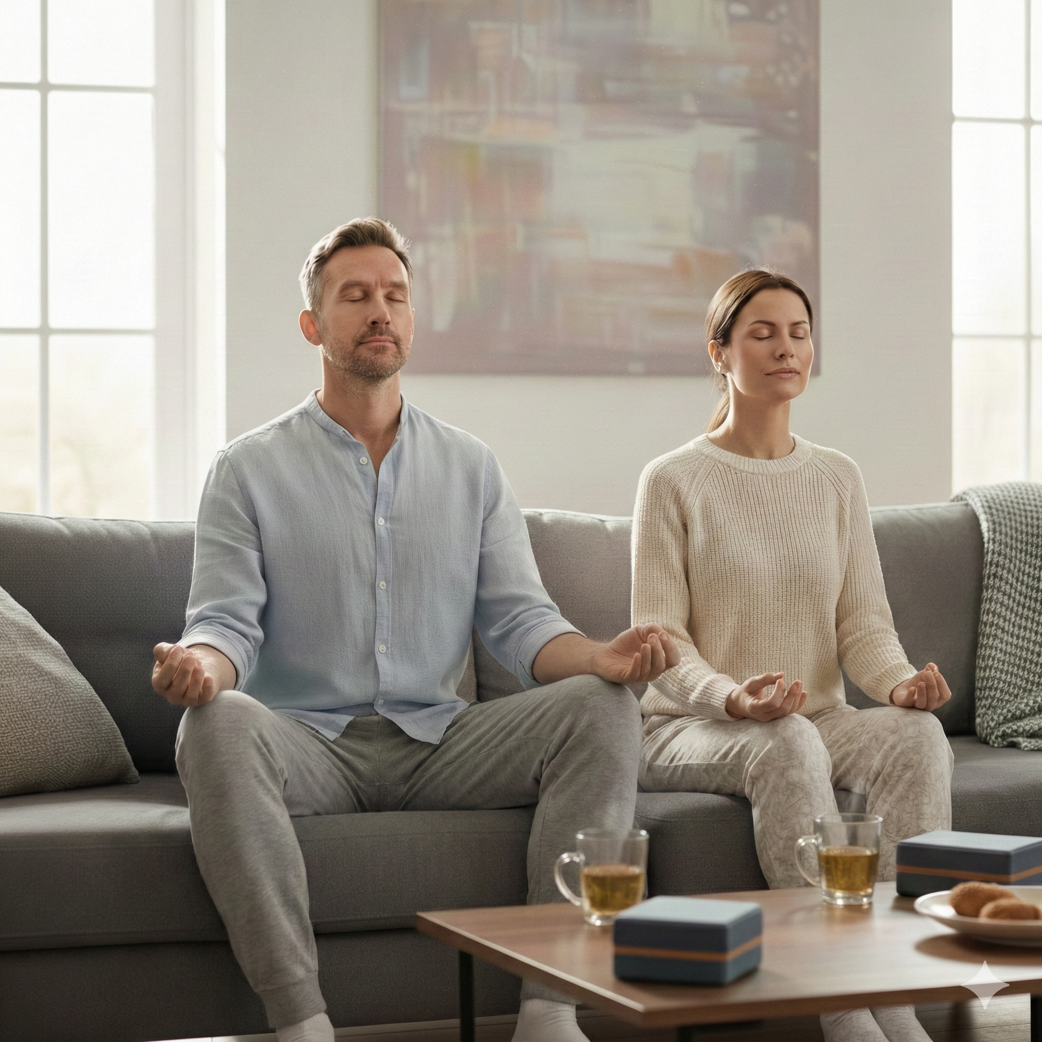 Sit in a comfortable position. First try it sitting upright, you can then always try it lying down with your knees bent or lying flat if that’s more comfortable.